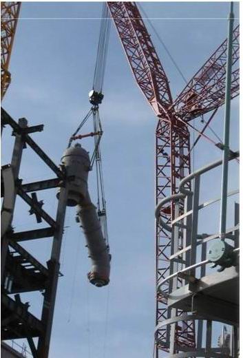 該氣化爐由西安熱工研究院自主研發設計、杭州鍋爐公司制造,系中國自主知識產權的首臺示范爐。其爐體總重600多噸,分上下兩段吊裝,上午10點,現場啟用1250噸履帶式起重機起吊,吊裝高度38米,整個吊裝不到1小時,就將氣化爐的300多噸上段部分與框架內的下段部分穩妥就位。該爐的就位為配置附爐管線、加快施工進度贏得了時間。