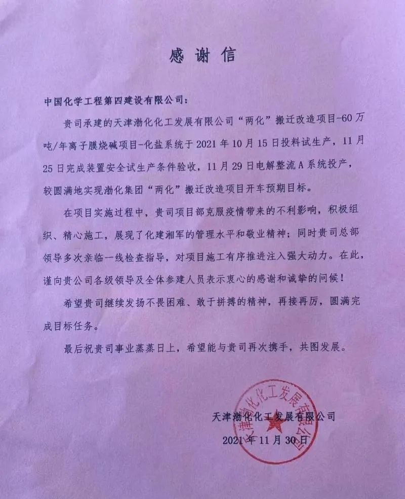 2021年11月29日,天津渤化“兩化搬遷”60萬噸離子膜燒堿項目電解整流A系一次送電成功,相繼產出燒堿、鹽酸等合格產品,進入試生產階段。