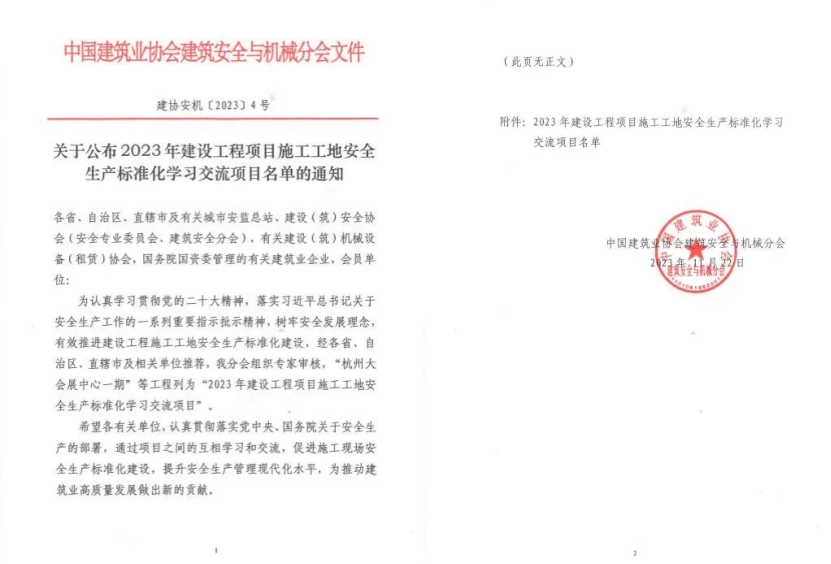 近日,中國建筑業(yè)協(xié)會(huì)建筑安全與機(jī)械分會(huì)公布《2023年建設(shè)工程項(xiàng)目施工工地安全生產(chǎn)標(biāo)準(zhǔn)化學(xué)習(xí)交流項(xiàng)目名單》,華東公司承建的中國絲路科創(chuàng)谷起步區(qū)1、3、7、8單元項(xiàng)目榮獲“全國建設(shè)工程項(xiàng)目施工工地安全生產(chǎn)標(biāo)準(zhǔn)化學(xué)習(xí)交流項(xiàng)目”稱號。