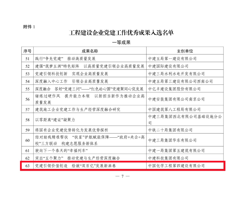 5月27日,從中國施工企業管理協會傳來喜訊,公司選送的黨建案例《黨建引領價值創造  繪就“雙百億”發展新畫卷》獲評2024年工程建設企業黨建工作一等成果,市政工程公司選送的黨建案例《黨建領航品牌紅  市政先鋒譜華章》和華南公司選送的黨建案例《黨建引領“粵向前” 融合發展譜新篇》獲評二等成果。